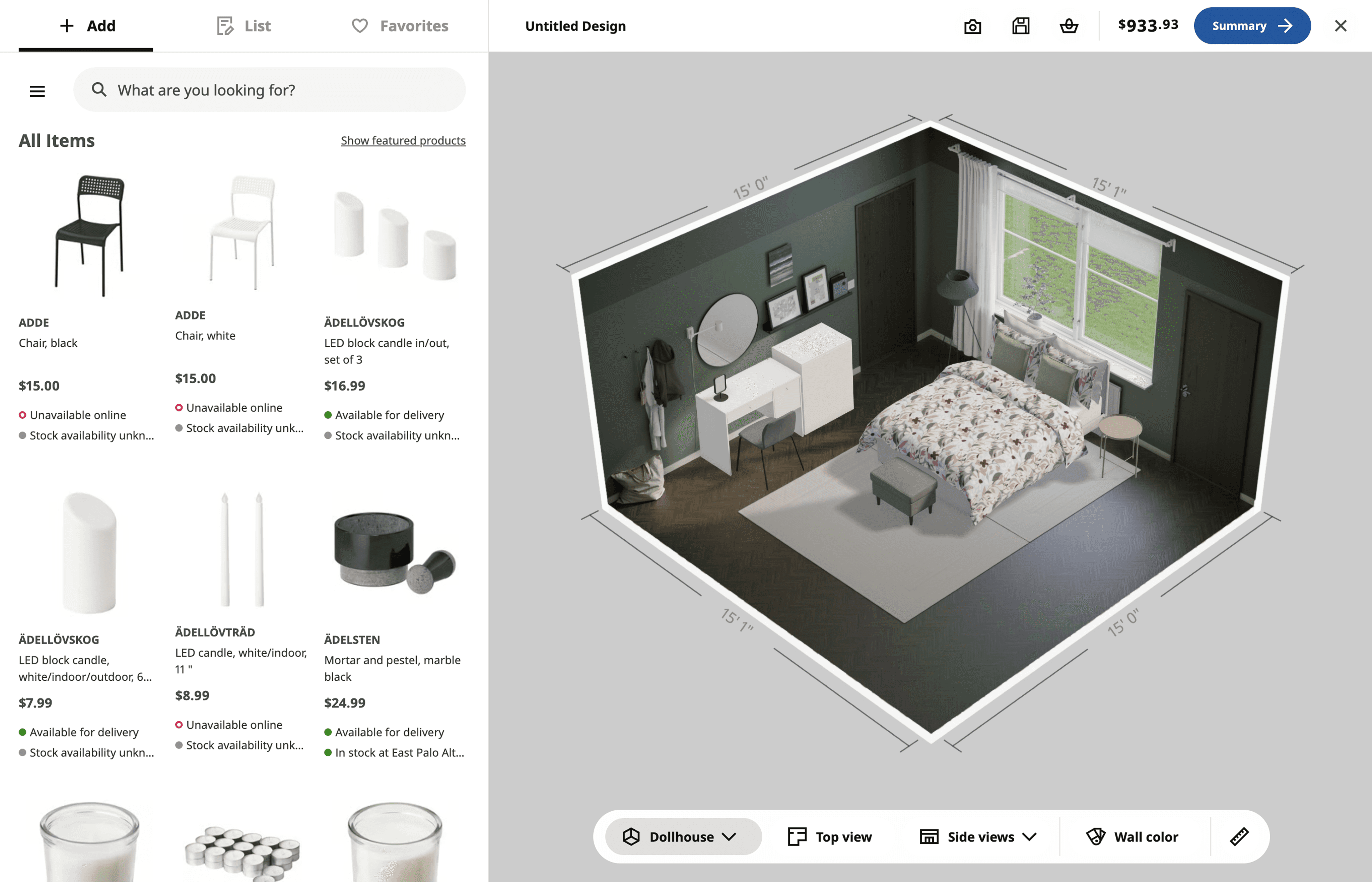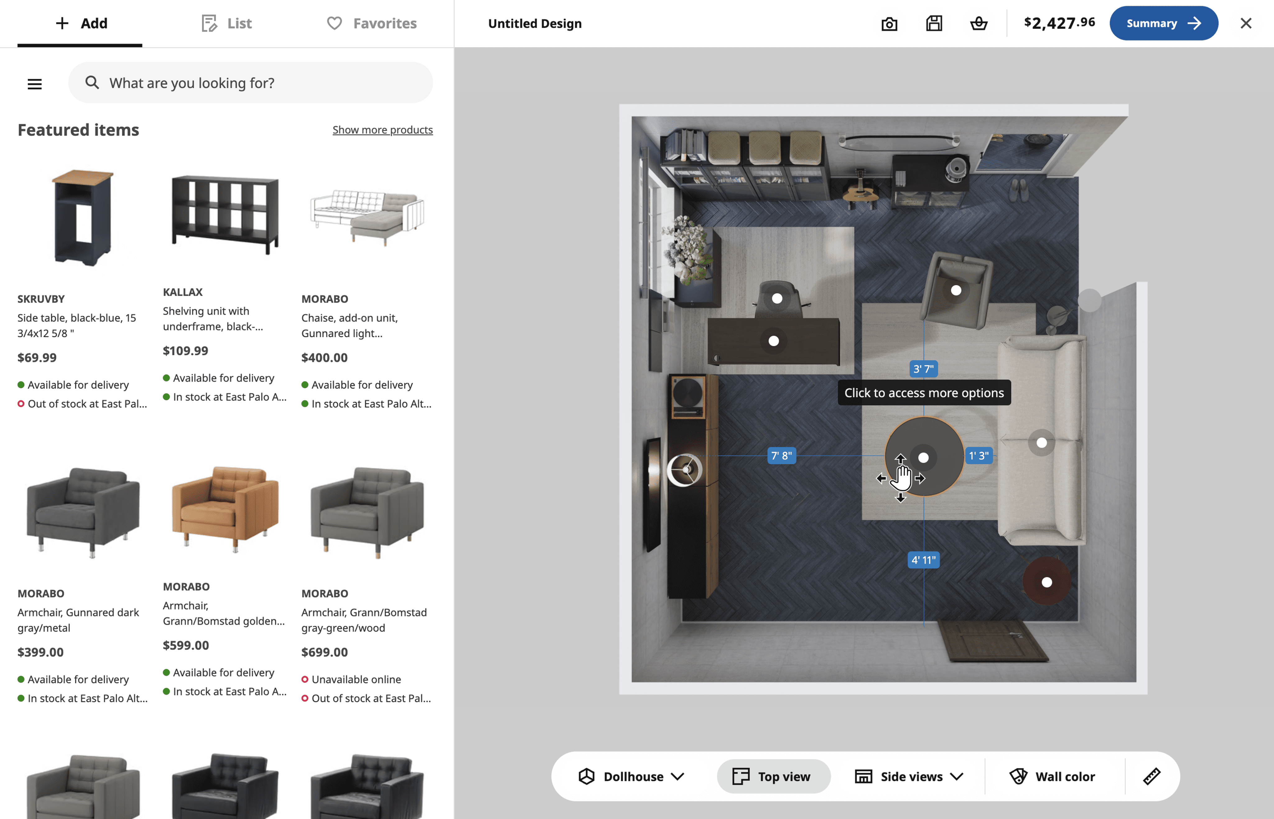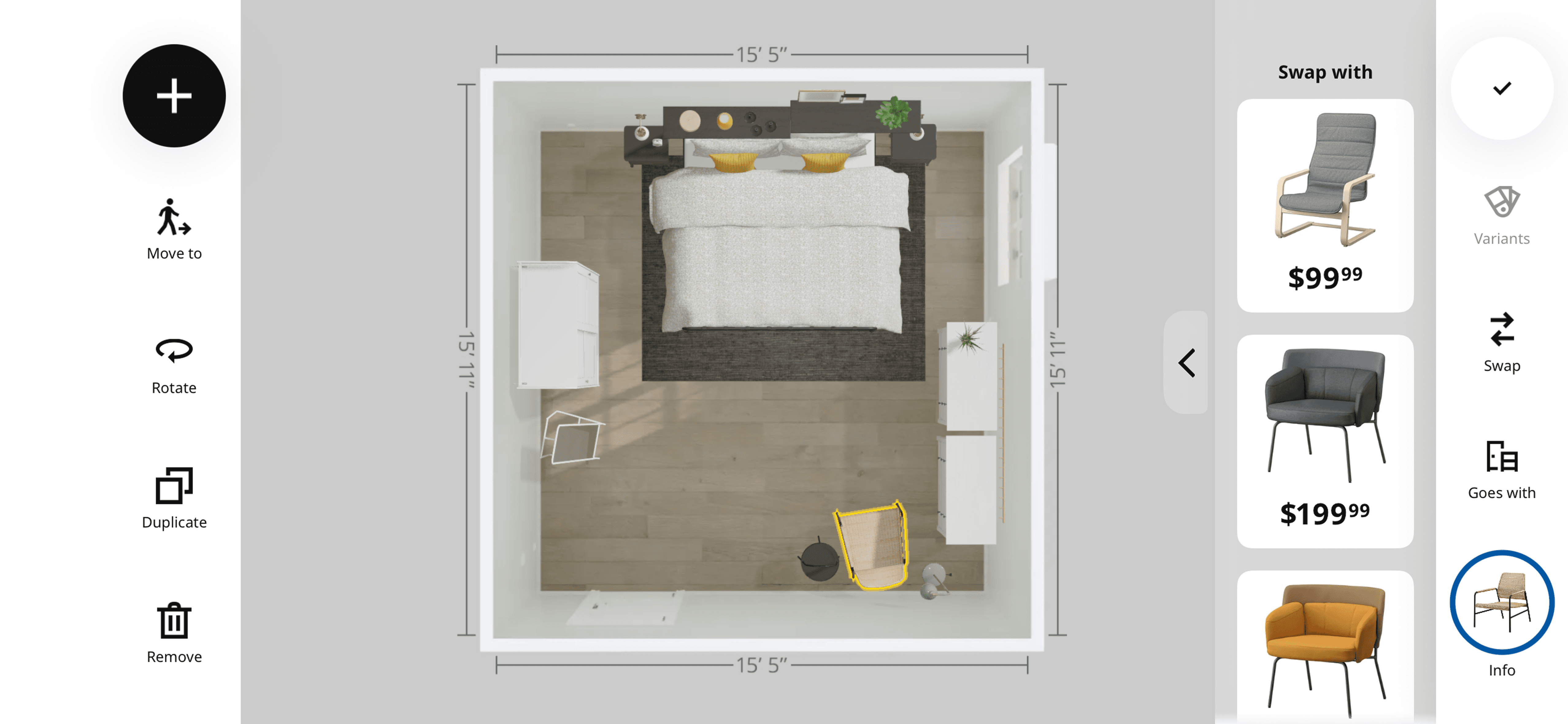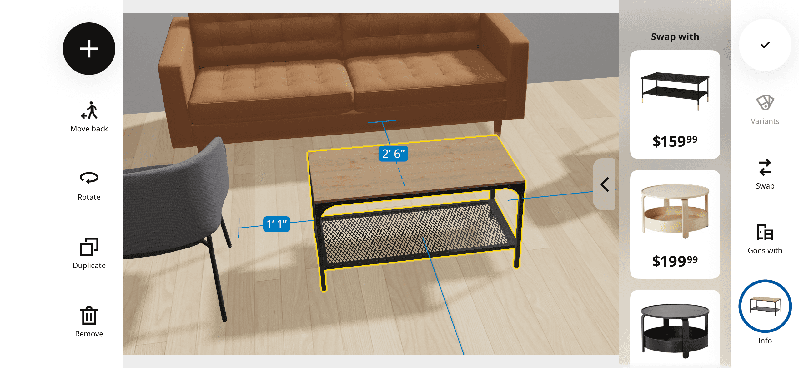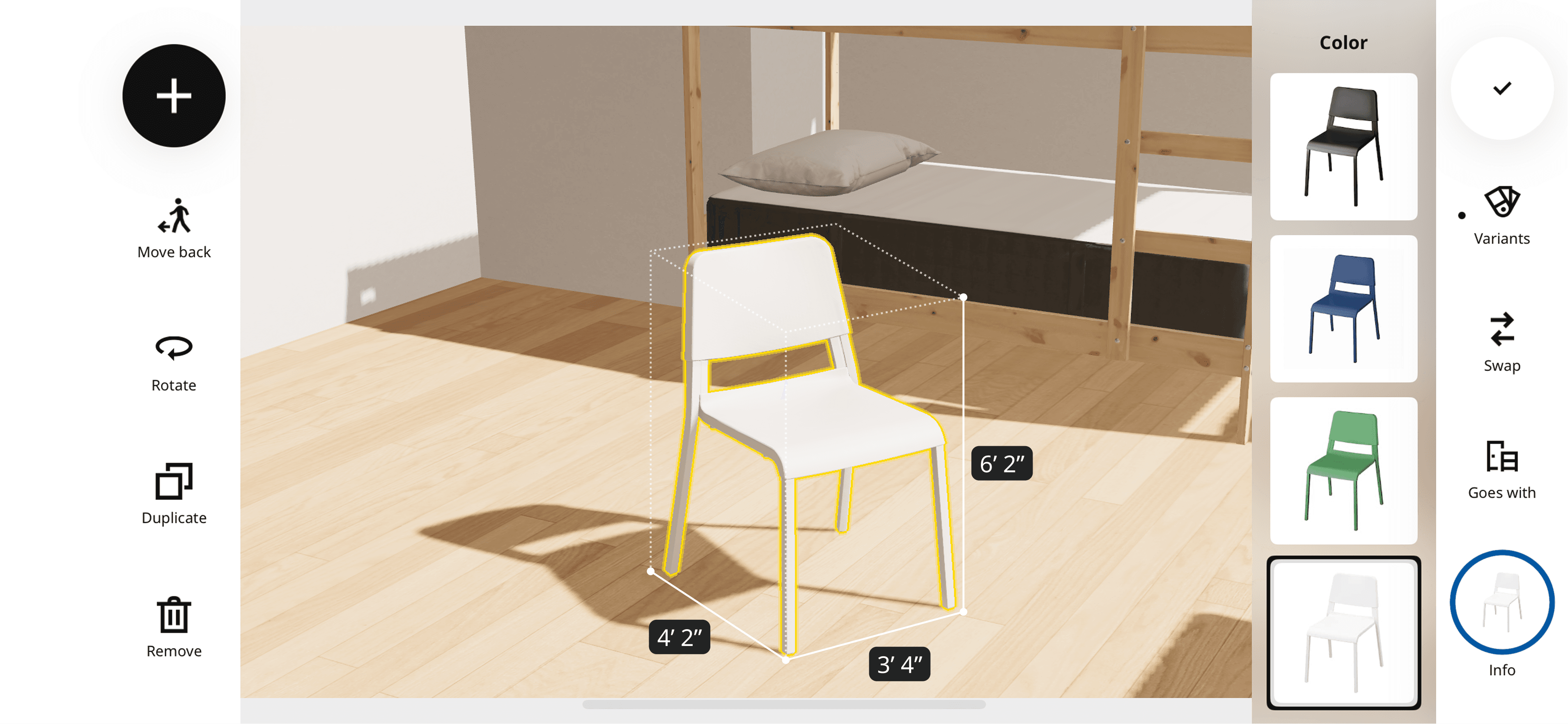 Product dimensions surface after an item is selected, visualizing the length, width, and height to help users assess how much space it occupies.